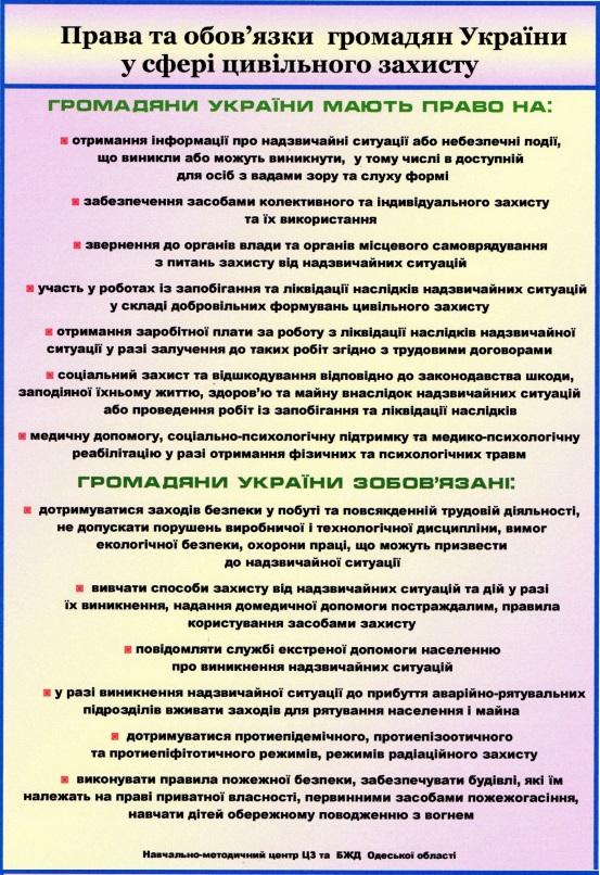 - права та обов’язки громадян у сфері цивільного захисту (відповідно до законодавства);