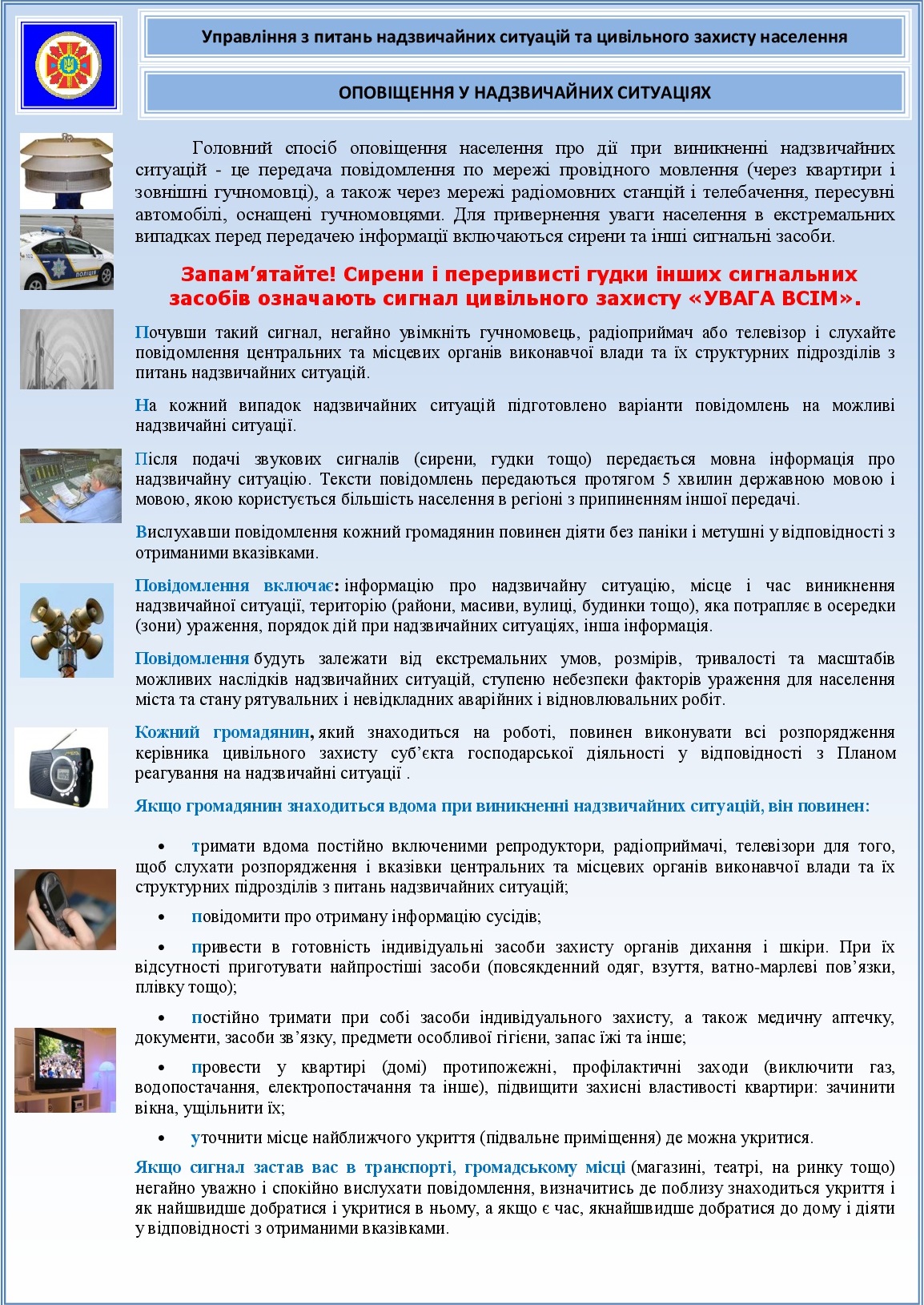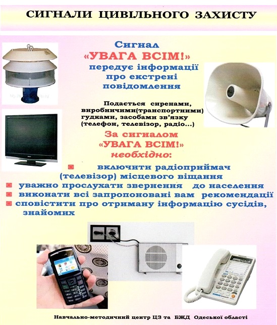 - сигнали цивільного захисту (порядок оповіщення працівників) в разі виникнення аварії, катастрофи або стихійного лиха, алгоритм дій учасників навчально-виховного процесу, персоналу навчального закладу з отриманням таких сигналів або інформації;