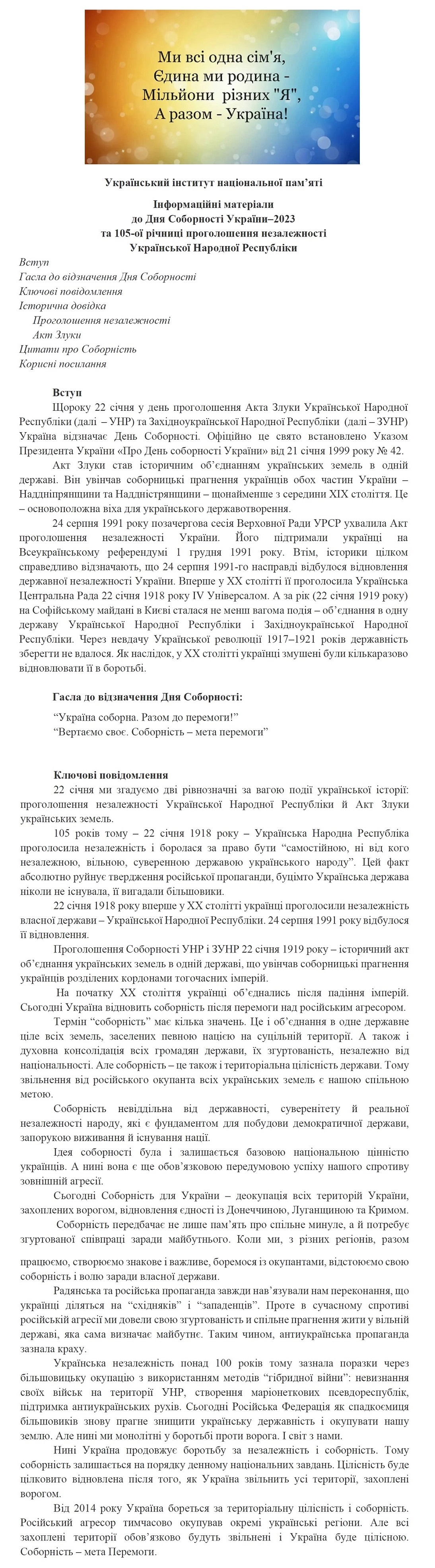 Інфографіка «Чому українці та росіяни історично – не «братні народи». Проєкт Міністерства культури та інформаційної політики й Українського інституту національної пам’яті містить 9 банерів. Наприклад, Україна та Росія розвивалися за різних історичних умов, мали впливи різних сусідів; Україна – не «молодший брат»; Україна – європейська країна.